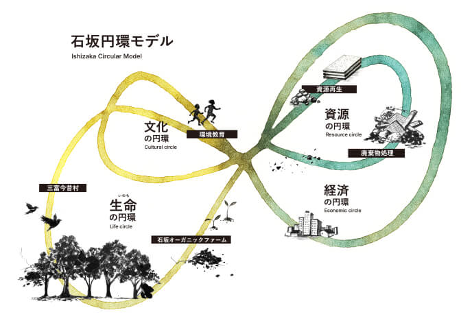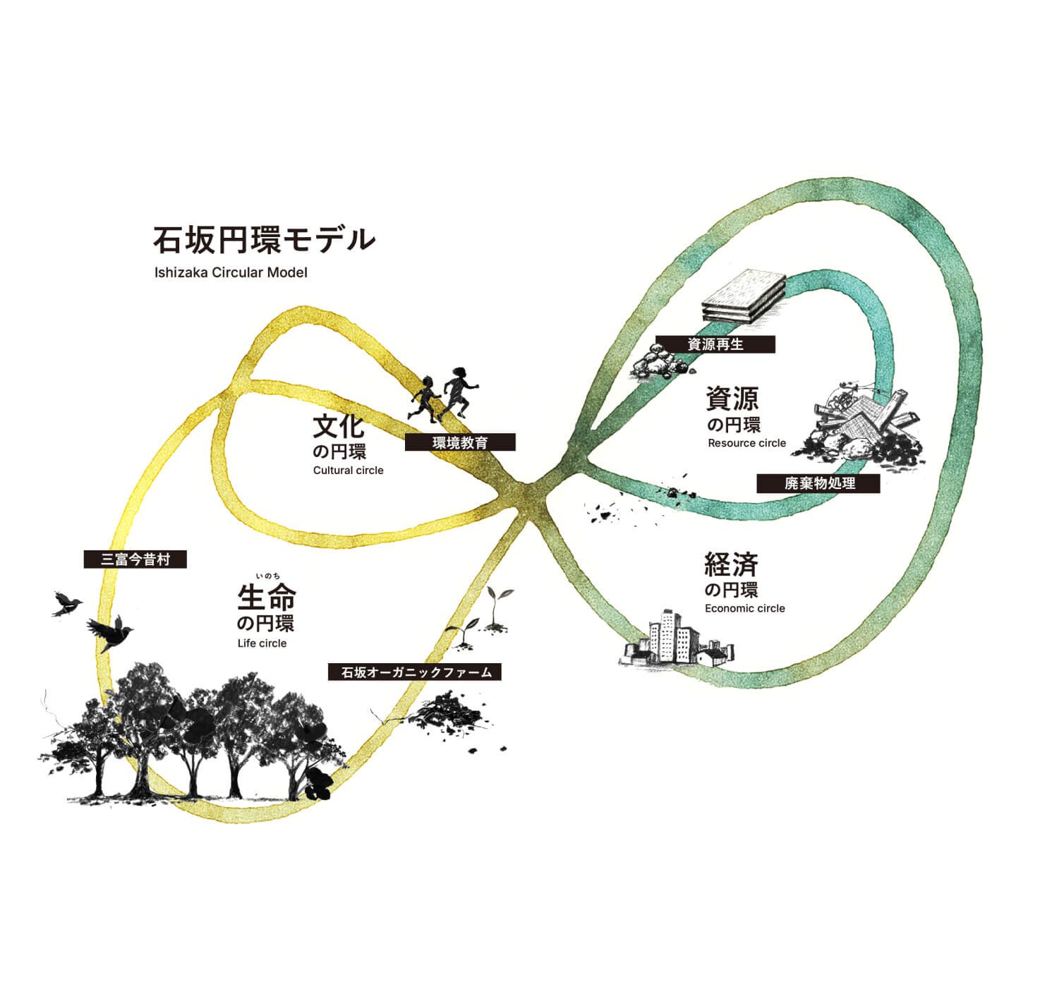 ごみをごみにしない「資源の円環」。環境と調和して産業を発展させる「経済の円環」。人と人、人と自然をつなぎ合わせ、新たに根付かせる「文化の円環」。そして、動物や森、土や水にいたるまで、いのちを宿すすべての存在と共に生きる「生命の円環」。これらの円環は、それぞれで閉じることなく、互いに呼応しながら、めぐり続ける未来へと続いていきます。