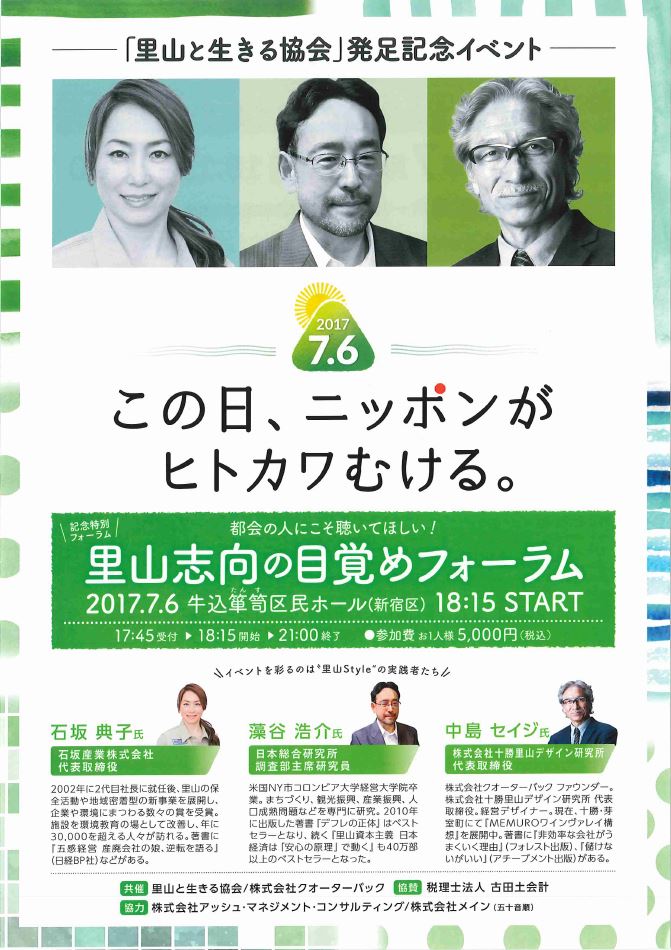7月6日(木)に開催される「里山志向の目覚めフォーラム」に、当社代表・石坂典子が登壇いたします。