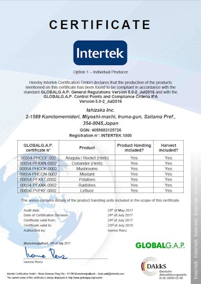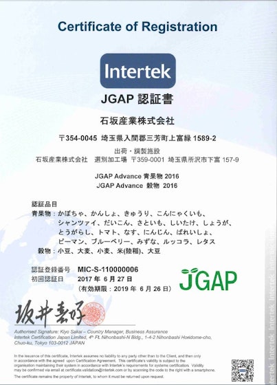 この度、当社の石坂ファームでは、「安全・安心でおいしい農産物」を皆さまに提供していくため、「GLOBAL GAP」、「ASIA GAP」を同時認証取得いたしました。「環境保全」と「食の安全」に関わる、持続可能な生産管理を実践することで、取り組みのレベルを上げていくことが期待されます。