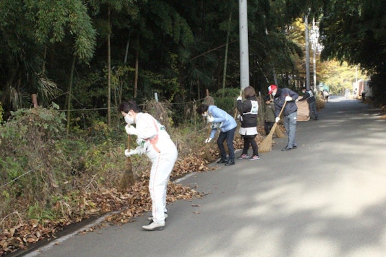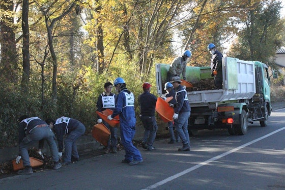落ち葉や土砂を集めて、普段私たちも使わせていただく公道をきれいにし、今回は合計6㎥分のごみを拾いました。