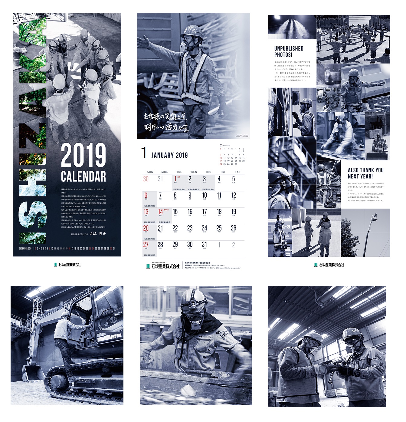 2019年のカレンダーは、これまでのカレンダーから一新し、環境の最前線であるリサイクルプラントで働く社員の姿を、ドキュメント写真で綴った『ISHIZAKA WORKERS CALENDAR』です。
