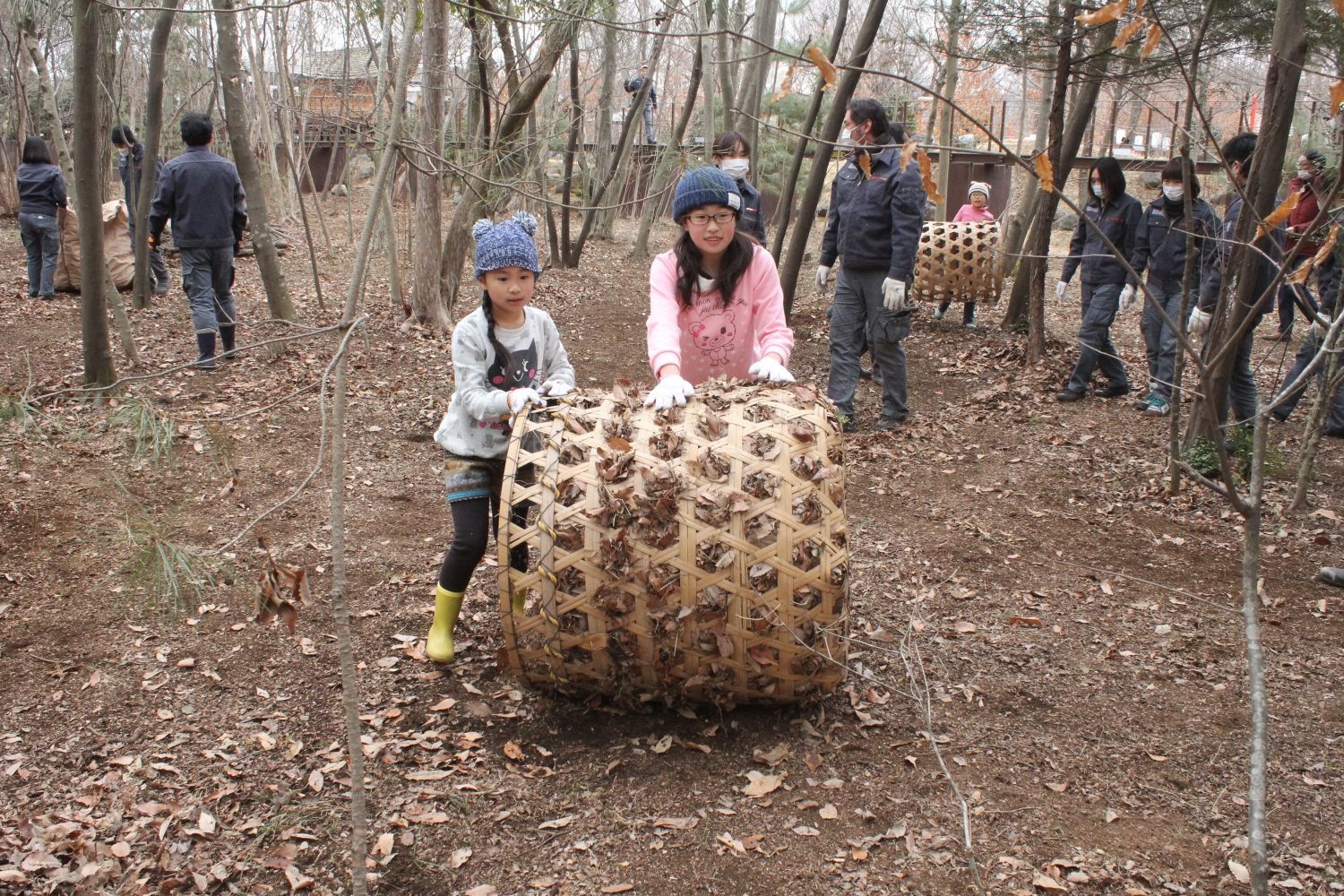 くぬぎの森の落ち葉を掃いて、集めて、籠に詰めて…寒さを吹き飛ばすくらいポカポカしてきます。