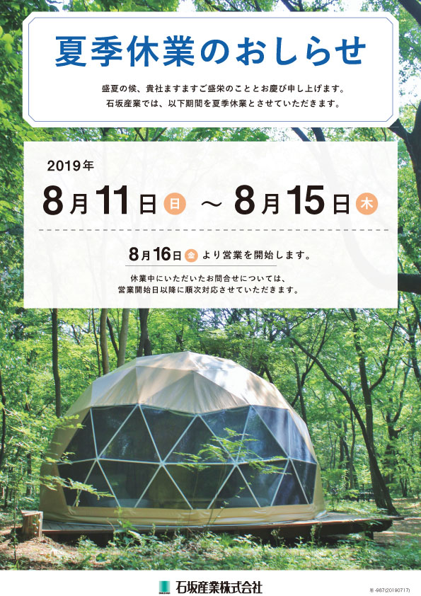 石坂産業株式会社グループ、および三富今昔村各施設は、 以下の期間夏季休業とさせていただきます。