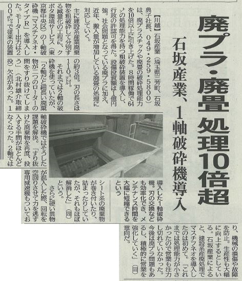 7月15日発行の循環経済新聞で、当社が導入した一軸破砕機について記事が掲載されました。