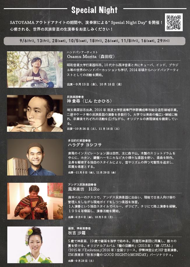 SATOYAMAアウトドアナイトでは、期間中の9日程で、アーティストの生演奏を聴きながら食事を楽しめる“Special Night”も開催。