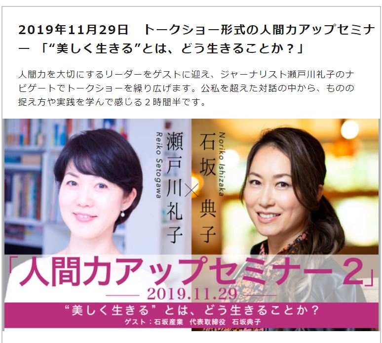 11月29日(金)、ジャーナリスト・瀬戸川礼子氏によるトークショー形式の人間力アップセミナーに石坂典子が登壇します。