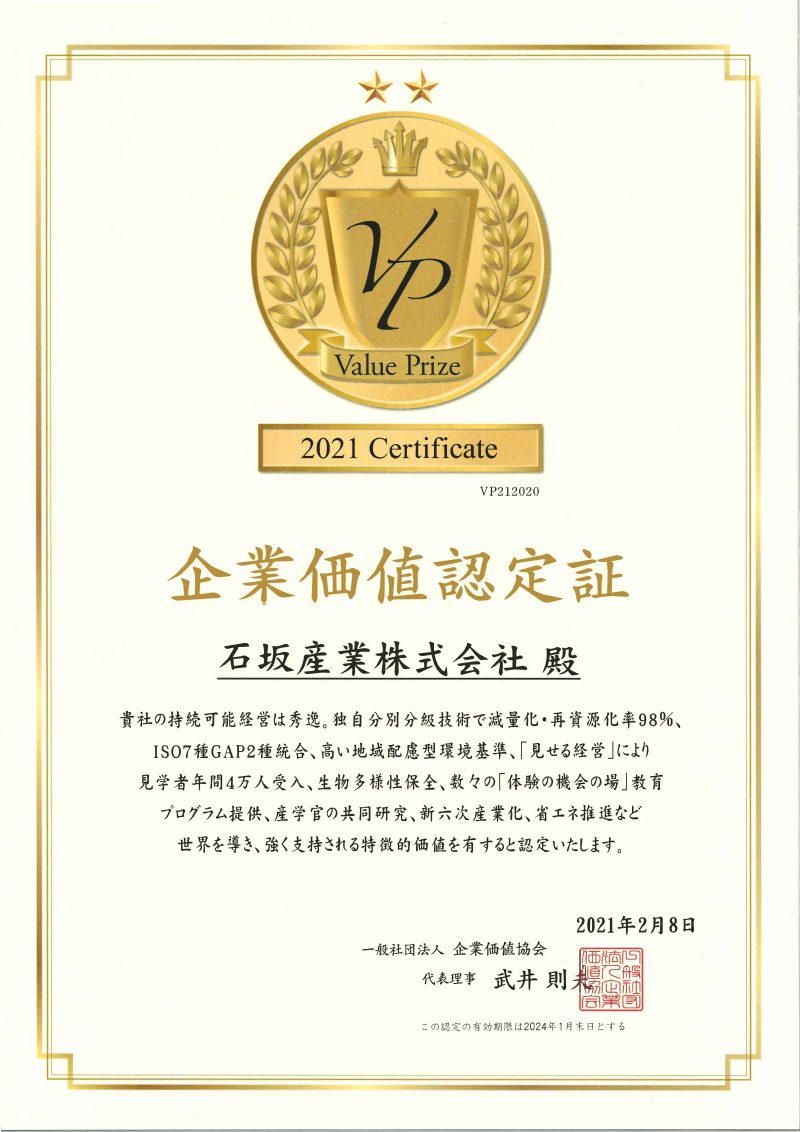 石坂産業は、2021年2月8日(月)に開催された、一般社団法人企業価値協会主催「2021年上期 企業価値認定式」にて、上期更新企業の一社として企業価値認定を受けました。