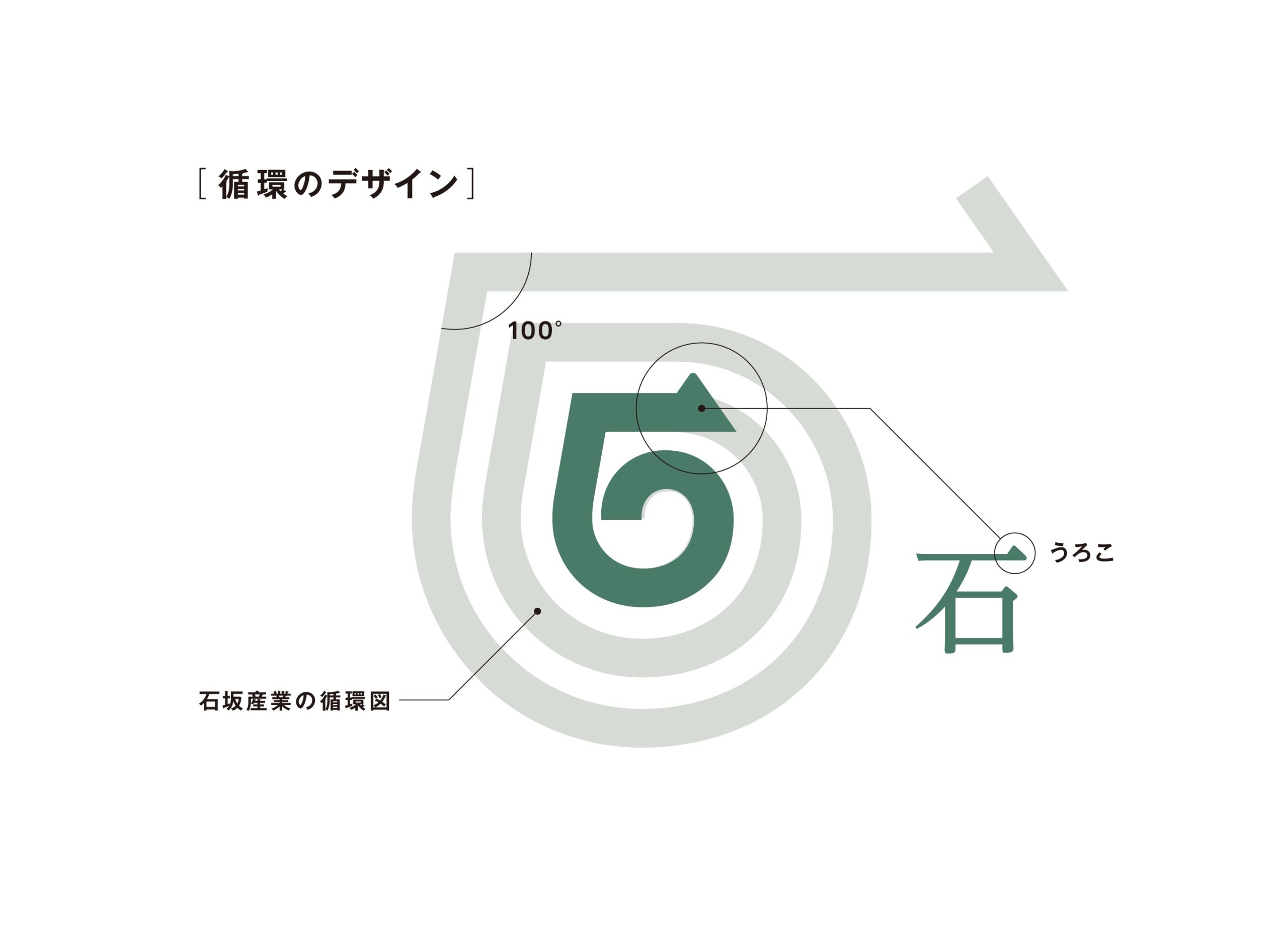 循環を円状の輪で表現することがよくあるのですが、私は以前から、同じところに戻る輪の表現に違和感を覚えていたこともあり、同じところには戻らない循環、つまりスパイラルの表現に石坂産業の「石」の漢字を重ねマークとしました。右上の明朝体の「うろこ」にあたる部分を矢印にし、回転(循環)しながら角も曲がり先へ向かっていく石坂産業の強い意志を、そこに表現しています。