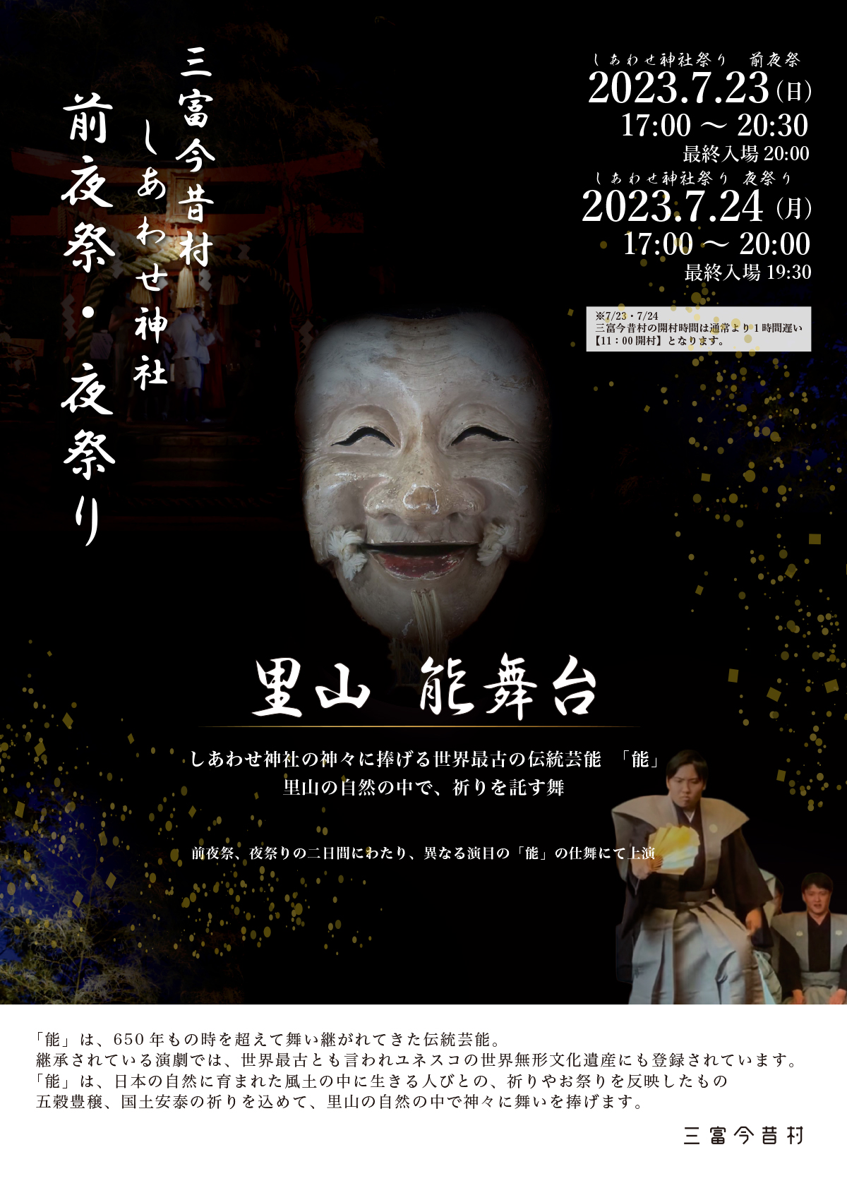 当日は、世界最古の伝統芸能とも言われユネスコの世界無形文化遺産にも登録される「能」を、幻想的な里山の屋外ステージで上演する「里山 能舞台」としてご覧いただけます。