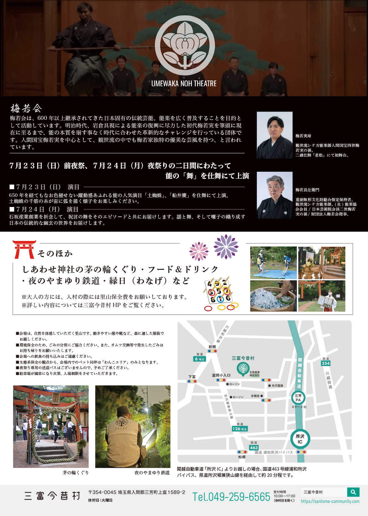 この当社の創業日である、7月24日(月)に、三富今昔村にて、【しあわせ神社の夜祭り】と題して創業祭を開催いたします。