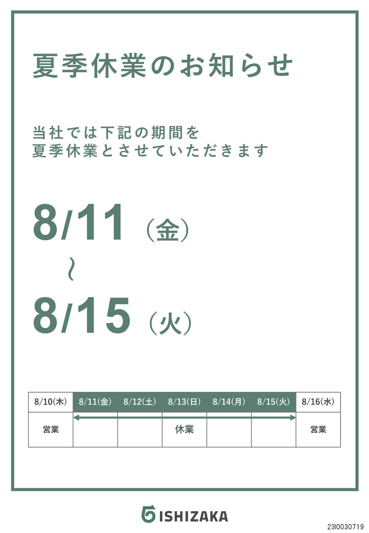 石坂産業は、以下の期間を夏季休業とさせていただきます。