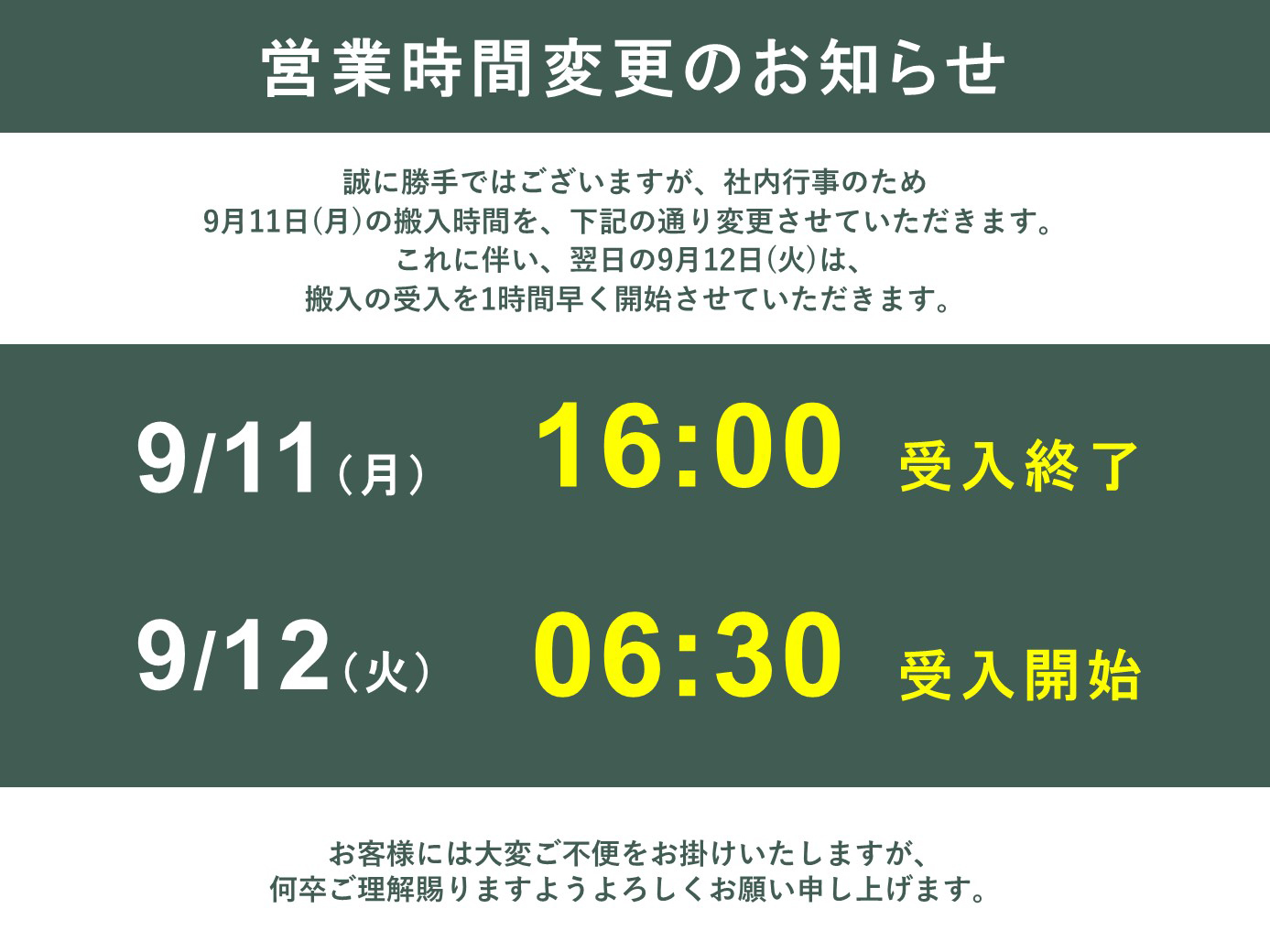 これに伴い、翌日の9月12日(火)は搬入の受入を1時間早く開始させていただきます。