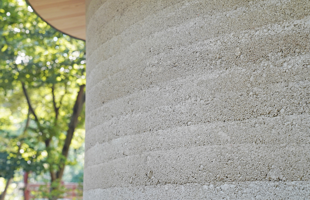 トイレの建物本体は、木造軸組構法でつくられ、社寺建築など高度な日本伝統の大工技術を有する寺島工務店(注5)によって日本の「伝統建築工匠の技(注6)」の一つとしてユネスコ無形文化遺産に登録されている「左官」の高度な技術の結晶として、版築という27層を丁寧に手で突き固めて重ねられた土の壁で仕上げられています。