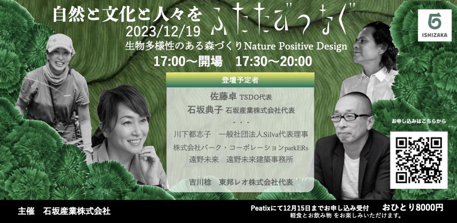12月19日(火)に東京都内kudan houseにて開催される「自然と文化と人々をふたたびつなぐ 生物多様性のある森づくり Nature Positive Design」に、当社代表取締役 石坂典子が登壇いたします。