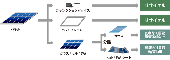 具体的には、ホットナイフ分離法®(注2)で約300℃に熱したナイフ状の刀を使用し、太陽光発電モジュールの表面ガラスをセルシートやその他部材から剥離します。アルミフレーム、金属、セルシート、ガラスなどに分離されたパネルは、それぞれリサイクル原料として資源循環を行います。