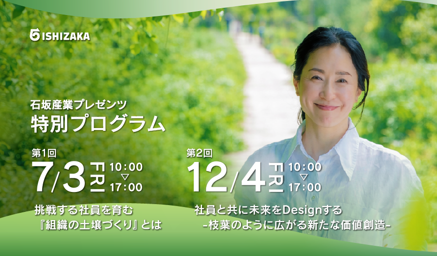 第1回プログラムでは、石坂典子が、社長就任から20年の歩みの中で培ってきた「挑戦する組織づくり」の思想と実践をお話しします。